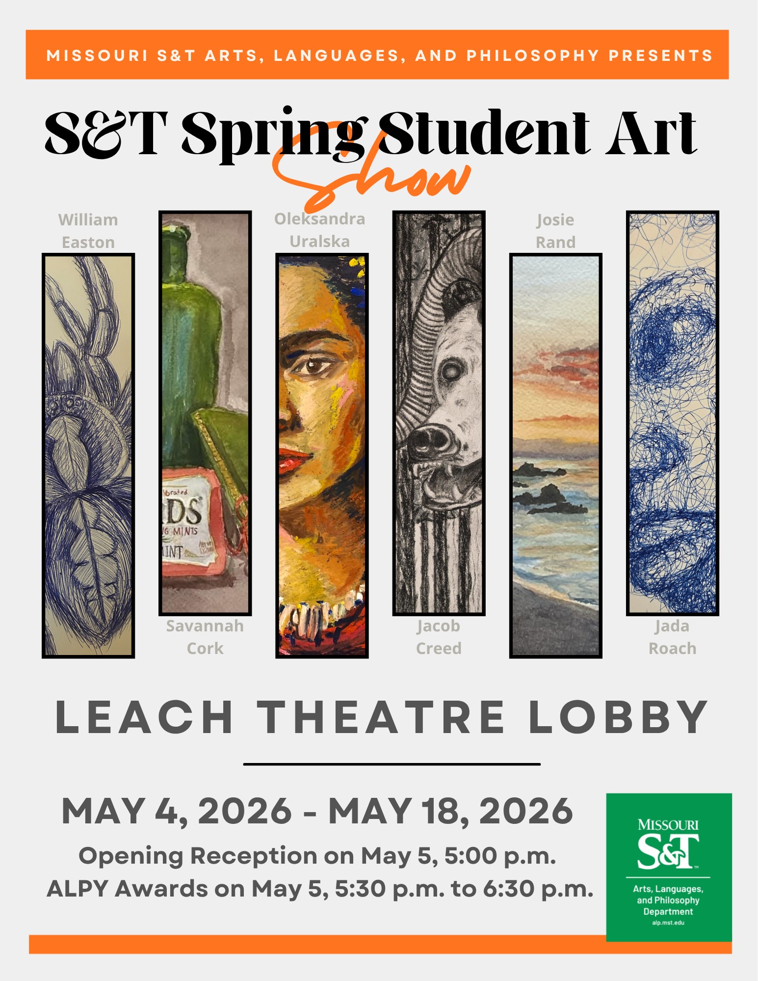 Our spring 2026 art show will feature art work by Missouri S&T students enrolled in drawing, painting, sculpture, photography, and art appreciation courses.